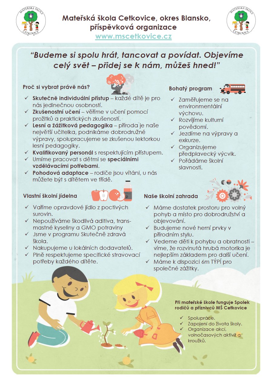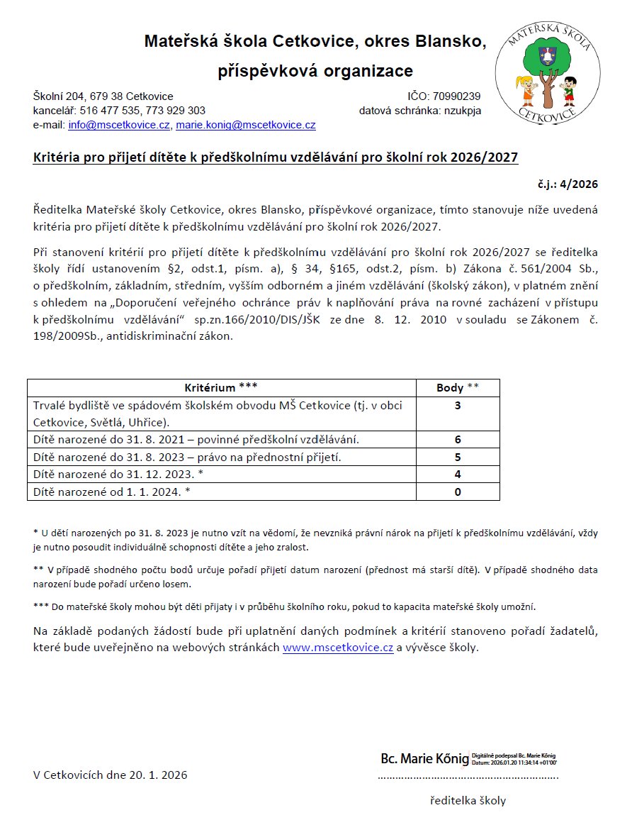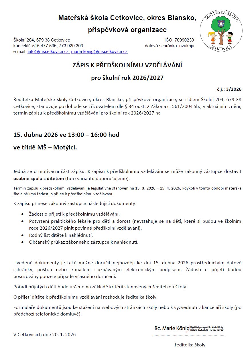Zápis do MŠ Cetkovice pro školní rok 2026/2027